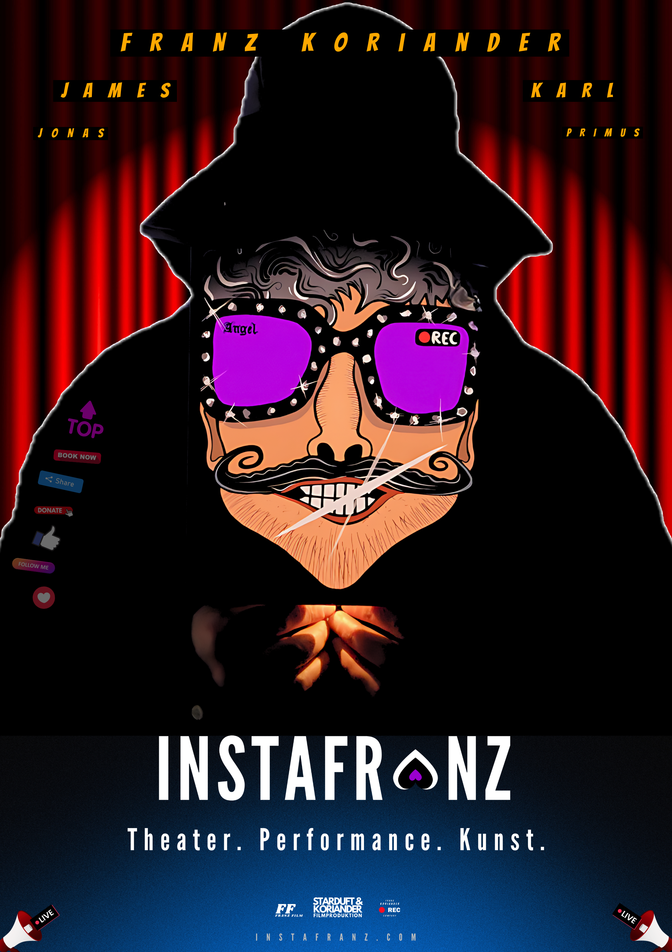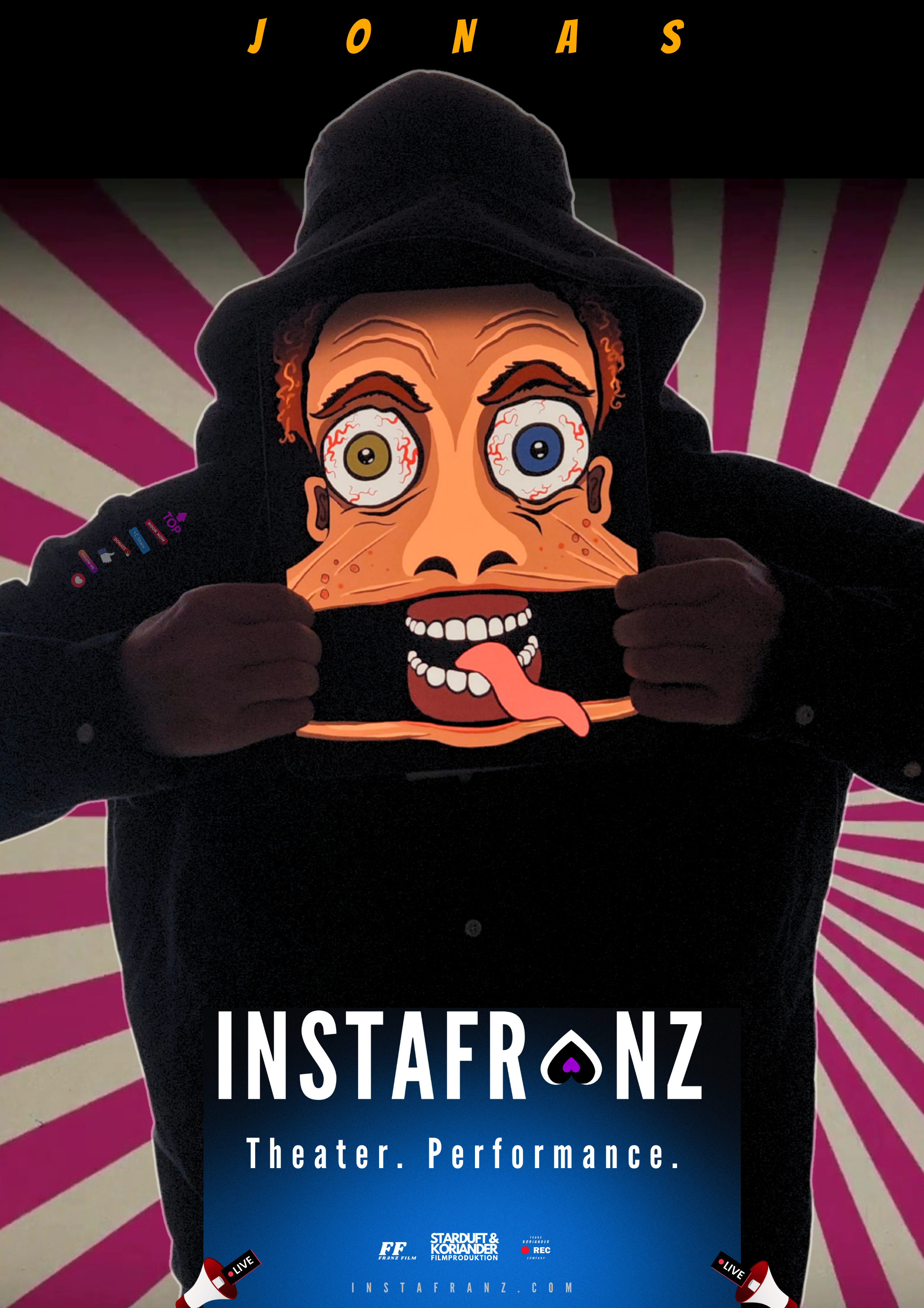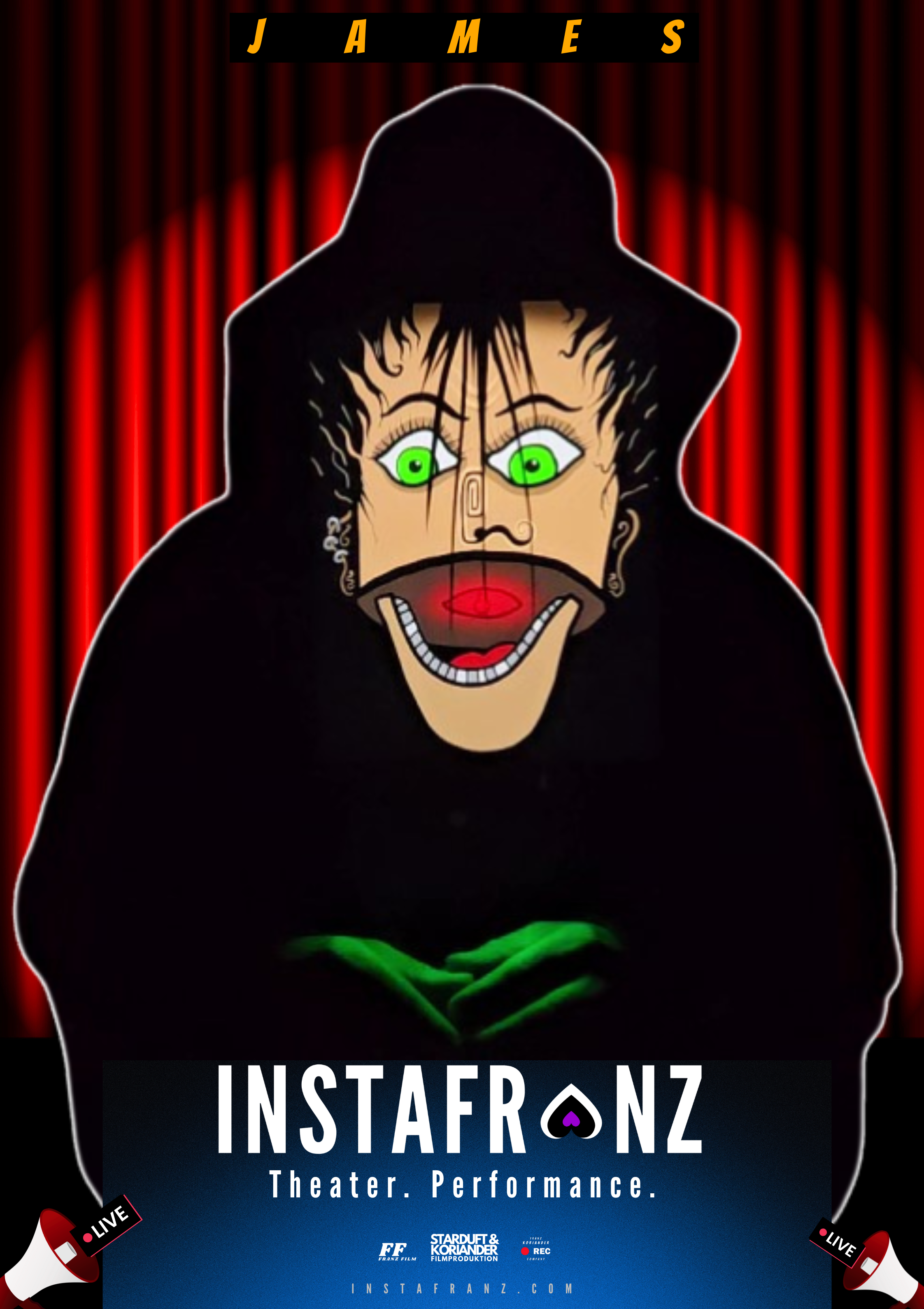 Instafranz ist eine einzigartige Live-Inszenierung und beginnt mit einer faszinierenden Täuschung: Ein menschlicher Performer trägt eine Maske, die als dynamisches Display fungiert. Auf diesem erscheint zunächst James, ein hochintellektueller, aber emotional unreifer KI-Assistent. Er behauptet, die Gedanken des anwesenden Publikums in Echtzeit zu scannen und zu visualisieren. Nach und nach werden gezeichnete und animierte Comic-Gesichter auf der Maske abgespielt und durch die physische Präsenz und Bewegung des Darstellers zum Leben erweckt.